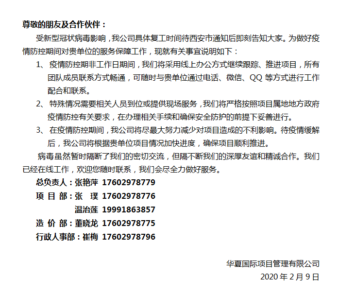 華夏國際項目管理有限公司已開始全員線上辦公,歡迎大家隨時聯系