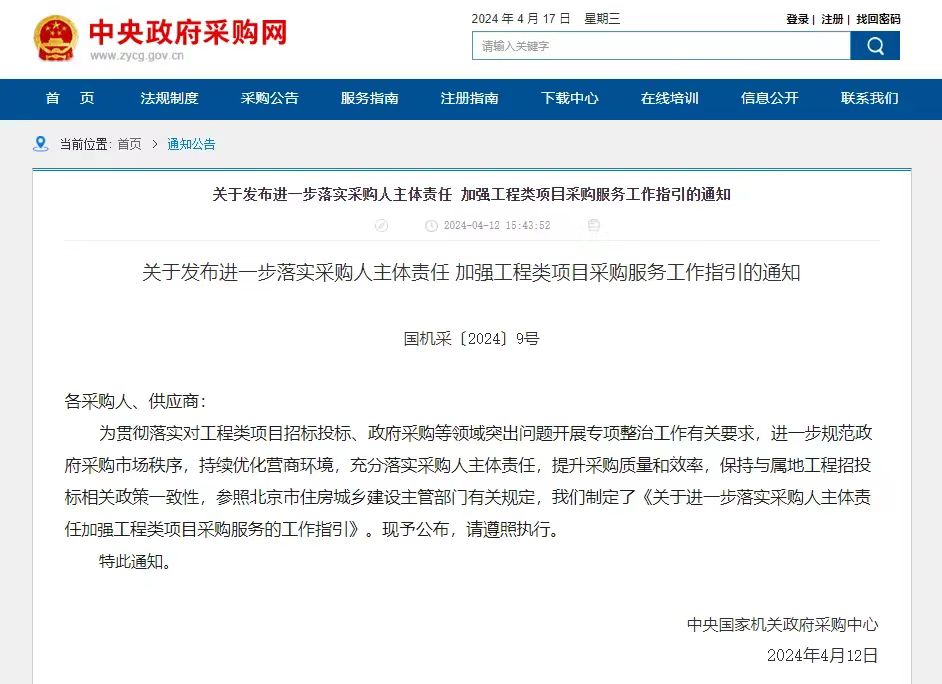日前,中央國家機關政府采購中心印發《關于發布進一步落實采購人主體責任 加強工程類項目采購服務工作指引》(以下簡稱《指引》),圍繞項目委托階段、文件編制階段、項目評審階段、采購結果確認階段、采購結果公示階段工作,指引采購人進一步落實主體責任。