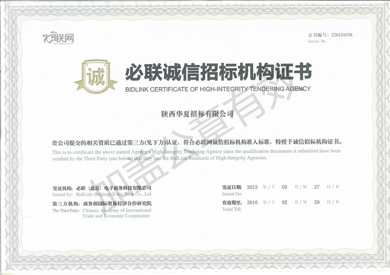 必聯(lián)誠(chéng)信招標(biāo)機(jī)構(gòu)證書(shū)
